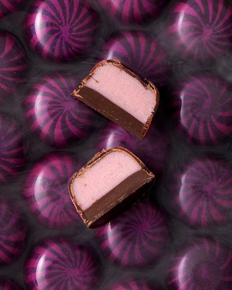 raspberry jelly paired with a milk chocolate and black licorice caramel ganache, in a hand-painted 66% dark chocolate shell